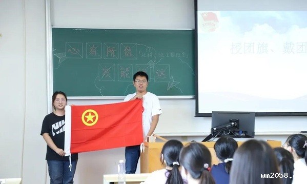 活动第二项,社政学院分团委副书记赵晨晨为团支书授团旗,团员佩戴团徽。