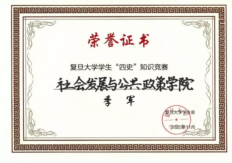 李际州同学表示,学习四史,是响应党的号召,更是履行肩上的责任。学习四史,不仅增添了我的知识面,同时还陶冶了我的爱国主义情操,让我与先烈们进行对话,与崇高者交流思想,也激发了我努力成为担当民族复兴大任的时代新人的动力。这次比赛,是我进入复旦校园以来的经历的十分重大的活动,比赛过程激烈紧张,队员们都用自己所学去抢答、去比拼,展现了社政学院学子的精神面貌和风采。比赛中,从一开始的短暂落后到最终在我们队伍所有队员的共同努力下获得季军,取得优异成绩,也展示了队员们临阵不乱、扎实学习四史的优秀品质。总之,此次比赛让我受益颇丰,让我更深入地感悟了四史,同时我也将怀着更饱满的激情投身学习,坚定信仰,融入到祖国发展的时代潮流中去!